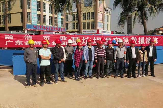 2019年11月21日(星期四)早上9:30,廣東金輝華集團公司承建的江門市供水管網擴容改造建設項目勘察設計施工總承包工程,在江門市蓬江區(qū)奇榜片區(qū)五邑機電城旁施工現(xiàn)場,進行”基坑坍塌應急救援演練”活動。演練的目的:1、評估安全事故的應急預案的響應啟動執(zhí)行力和響應及時性,分析預案內容的針對性和真實性;2、檢驗應急響應人員對應急預案的了解及實際操作熟悉能力,對應急物資的使用熟悉程度,評估應急知識培訓的