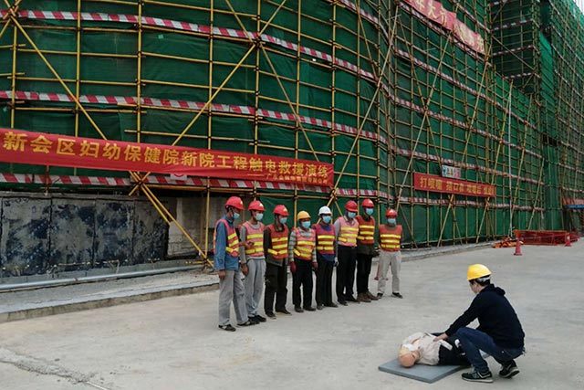 為了保障作業(yè)人員安全和財產免受損失,加強員工的觸電救援、消防意識,提高意外事故的搶險救援和自我防范能力,熟悉觸電救援、消防應急方法。根據廣東省市場監(jiān)管局印發(fā)《關于全力推動市場主體復工復產復市的通知》,結合防控疫情的形勢,把復工復產工作抓實抓細抓落地,做到抗擊疫情和經濟發(fā)展兩手抓、兩不誤。2020年4月13日,廣東金輝華集團有限公司江門區(qū)域公司在新會區(qū)婦幼保健院新院工地舉行作業(yè)現(xiàn)場應急處置演練,主要