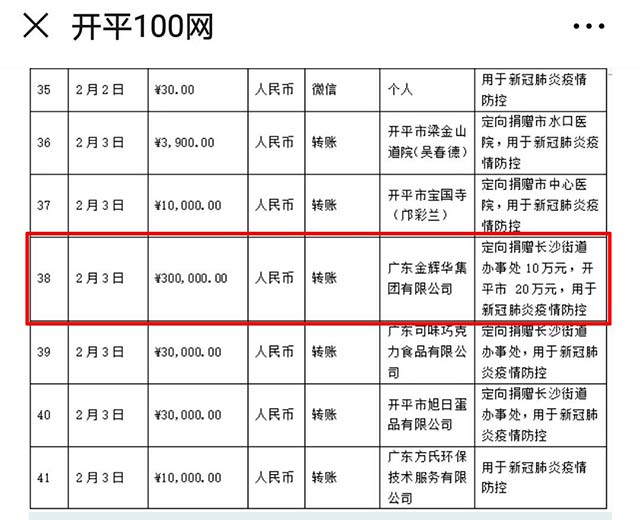 廣東金輝華集團有限公司疫情防控貢獻和復工復產工作略記 一、涓涓細流,匯成大海;點點星光,照亮銀河。今年春節(jié),一場突如其來的新型冠狀病毒感染的肺炎疫情牽動著每一個人的心,更牽動著每一位金輝華人。新型冠狀病毒感染的肺炎疫情(簡稱“疫情”)發(fā)生后,在習近平總書記:生命重于泰山,疫情就是命令,防控就是責任的指引下,并在開平市新冠肺炎疫情防控指揮部的統(tǒng)一部署下,開平市紅十字會,慈善會共同發(fā)布了《開平市紅十字