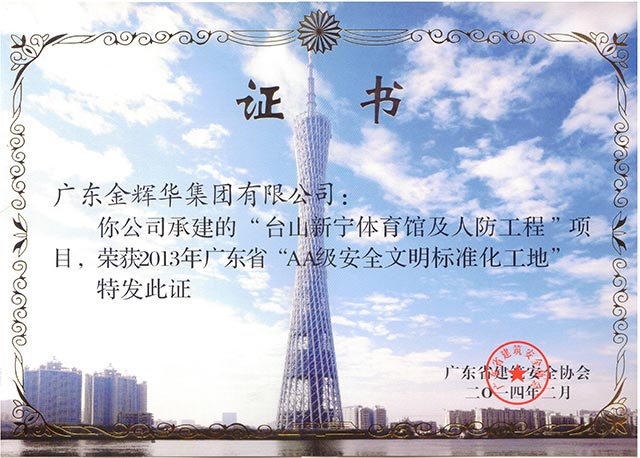 熱烈慶祝我公司“臺(tái)山市新寧體育館及人防工程”榮獲AA級(jí)安全文明標(biāo)準(zhǔn)化工地。
