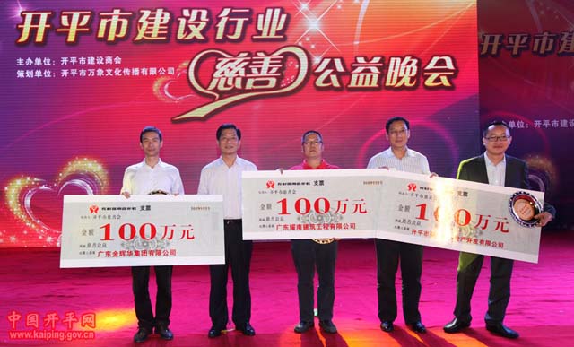 2013年3月22日,開平市建設(shè)商會(huì)主辦的“開平市建設(shè)行業(yè)慈善公益晚會(huì)”在人民公園隆重舉行。江門市住房城鄉(xiāng)建設(shè)局局長馬克烈,開平市黃耀雄、文彥、吳平超、張星杰等四套班子領(lǐng)導(dǎo),我集團(tuán)公司董事長張國球、總裁李甫等均出席晚會(huì)。在慈善公益晚會(huì)中,表演者帶來了豐富多彩的節(jié)目,演出涵蓋舞蹈、雜技、獨(dú)唱等,讓觀眾體會(huì)到歌聲的力量和溫情,激發(fā)大眾對公眾事業(yè)的熱忱。捐贈(zèng)儀式穿插其中,我司以及耀南公司、碧桂園公司各捐