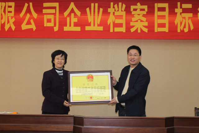 2010年12月24日上午“廣東金輝華集團有限公司企業(yè)檔案目標管理國家二級認定會”在集團技術(shù)中心會議室舉行,我司最終以88.2分的高分通過了企業(yè)檔案目標管理國家二級認定。圖為:我司接受企業(yè)檔案工作目標管理二級牌匾與會人員有江門市檔案局副局長...