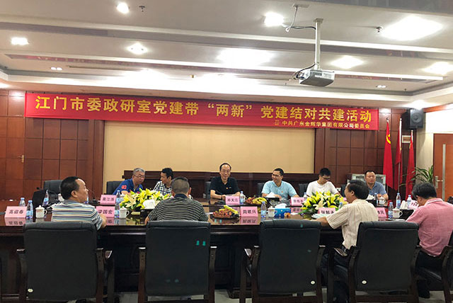 --記我司與江門市政研室結對共建座談會 為切實加強“兩新”黨建工作,鞏固“結對共建”成果,推動黨建創(chuàng)新發(fā)展,6月14日下午,江門市委秘書長、市委政研室主任、市委改革辦主任鄭文江,市委政研室副主任、黨支部書記李瀾一行到我司開展黨建專題調研,并召開黨建“結對共建”工作座談會。開平市委辦副主任曹偉平、長沙街道辦黨工委委員蘇國亮、我司董事局主席周珉興、黨委書記、副總裁張解矛、黨委副書記、副總裁盧文權、工