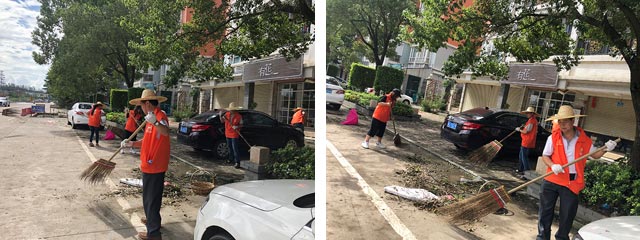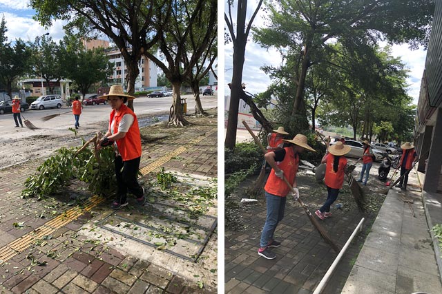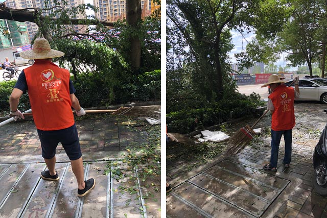 在清理路障現(xiàn) 場(chǎng),公司黨委書記張解矛帶領(lǐng)大家一起頂烈日冒酷暑,搬樹枝、掃殘葉、清廢物,將路面清理打掃干凈。