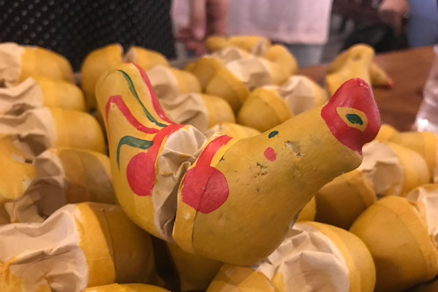 開平市水口鎮(zhèn)聯(lián)竹鄉(xiāng)制作鎮(zhèn)濠泥雞玩具已有二百多年歷史,以前每到農(nóng)歷春節(jié)前夕,來自鶴山、臺(tái)山、恩平、新會(huì)等地的商販們便駕車來采購泥雞作年貨銷售。泥雞外形古樸、價(jià)格便宜,深受人們的喜愛。大年初一是雞日,大量泥雞上市,一時(shí)泥雞啼聲四起,給人們帶來歡欣和喜氣。