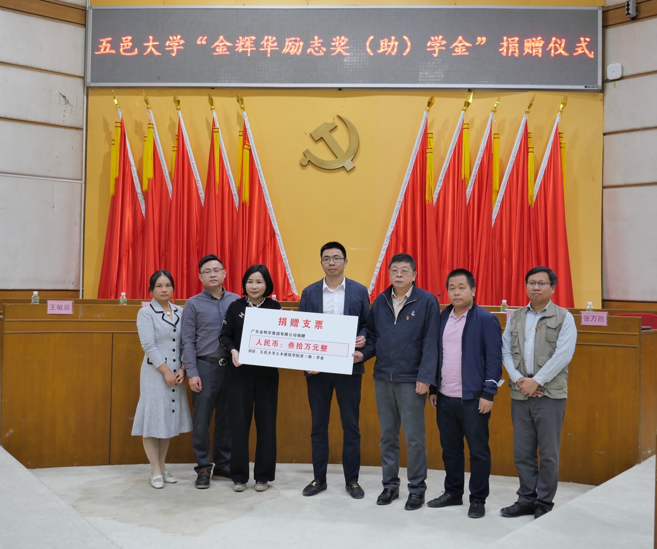 為進(jìn)一步加強(qiáng)校企合作,激勵(lì)五邑大學(xué)學(xué)子刻苦學(xué)習(xí)、奮發(fā)向上,廣東金輝華集團(tuán)有限公司與五邑大學(xué)達(dá)成協(xié)議,2021年起在五邑大學(xué)設(shè)立了“金輝華勵(lì)志獎(jiǎng)(助)學(xué)金”?,F(xiàn)為見(jiàn)證此次校企合作,五邑大學(xué)舉辦了“金輝華勵(lì)志獎(jiǎng)(助)學(xué)金”捐贈(zèng)儀式。
