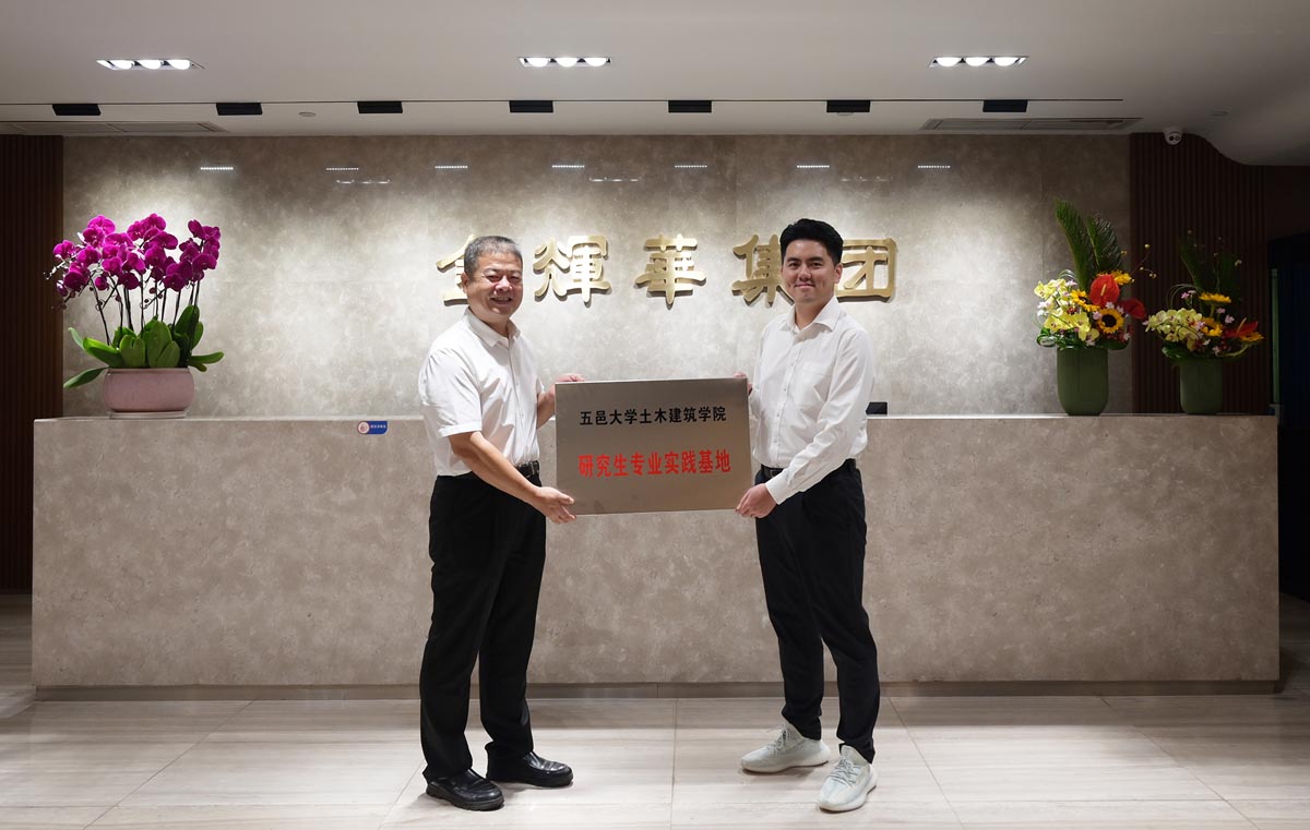 在會上,曾暉院長還詳細介紹了五邑大學的科研合作、研究生培養(yǎng)及產(chǎn)教融合等情況,并表示近年來學校在教學和科研方面都取得了長足的進步。對此,集團領(lǐng)導也期望往后校企雙方有更進一步的產(chǎn)學研合作,不僅為土木建筑學院的教學研究提供有力支持,同時也為我們企業(yè)的發(fā)展賦能,形成校企合作共贏的良好局面。最后,校企雙方進行了“五邑大學土木建筑學院研究生專業(yè)實踐基地”授牌儀式。